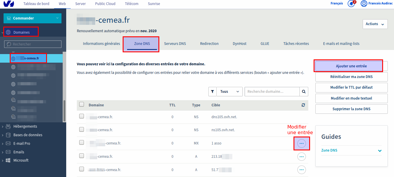 - (Voir ci-dessous) : Modifier les entrée DNS de votre domaine chez votre fournisseur de domaine (OVH, Gandi, Ouvaton…)