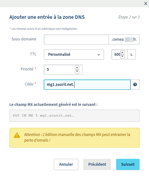 Si vous utilisez les listes de diffusion (avec le module sympa optionnel dans Zourit), il vous faut paramétrer 2 autres entrées DNS.