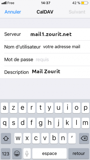 mail1.zourit.net (ou mail.cemea.org)votreadresse@domainezourit.net (ou votre domaine perso dans Zourit)votre mot de passe Zourit (celui de la messagerie et du cloud)Le champ « Description » est de votre initiative, vous pouvez par exemple y indiquer « Agendas » ou « Calendriers »…