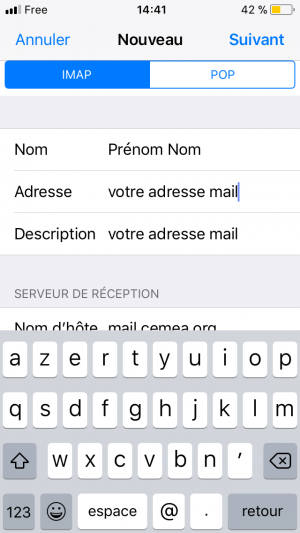 Complétez comme indiqué dans l’illustration en commençant par choisir le mode IMAP. Encore une fois le choix de la « description » vous appartient.