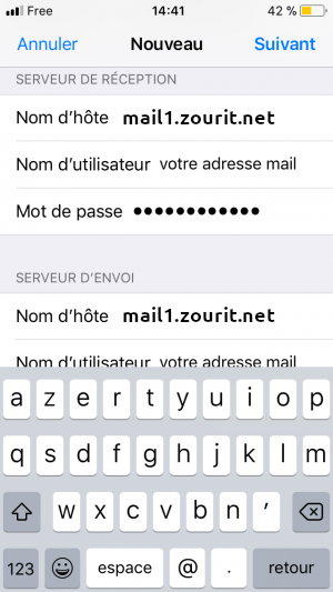 mail1.zourit.net ou mail.cemea.orgvotreadresse@votredomainezourit.fr (ou votre domaine dans Zourit.net)votre mot de passe Zourit (celui de la messagerie et du cloud)Cliquez enfin sur suivant. Et c'est terminé.