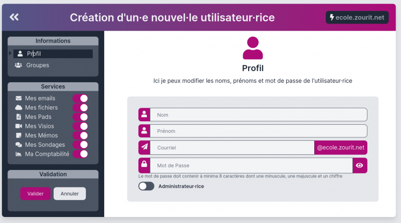 Compléter les champs. Il est possible d'associer aussitôt un·e utilisateur·ice à un groupe, avec l’icône “Groupes” et en cochant les groupes voulus.