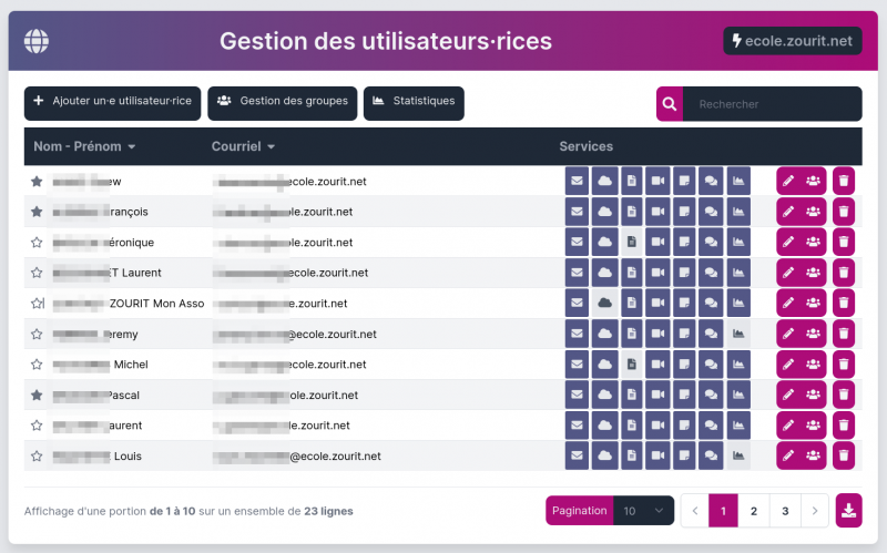 Cette page vous présente la page des utilisateurs·rices, des groupes, des services associés à chacun·e (mail, agenda, cloud…), les admin·e·s (étoile noire) ainsi que les statistiques d'utilisation de votre espace.