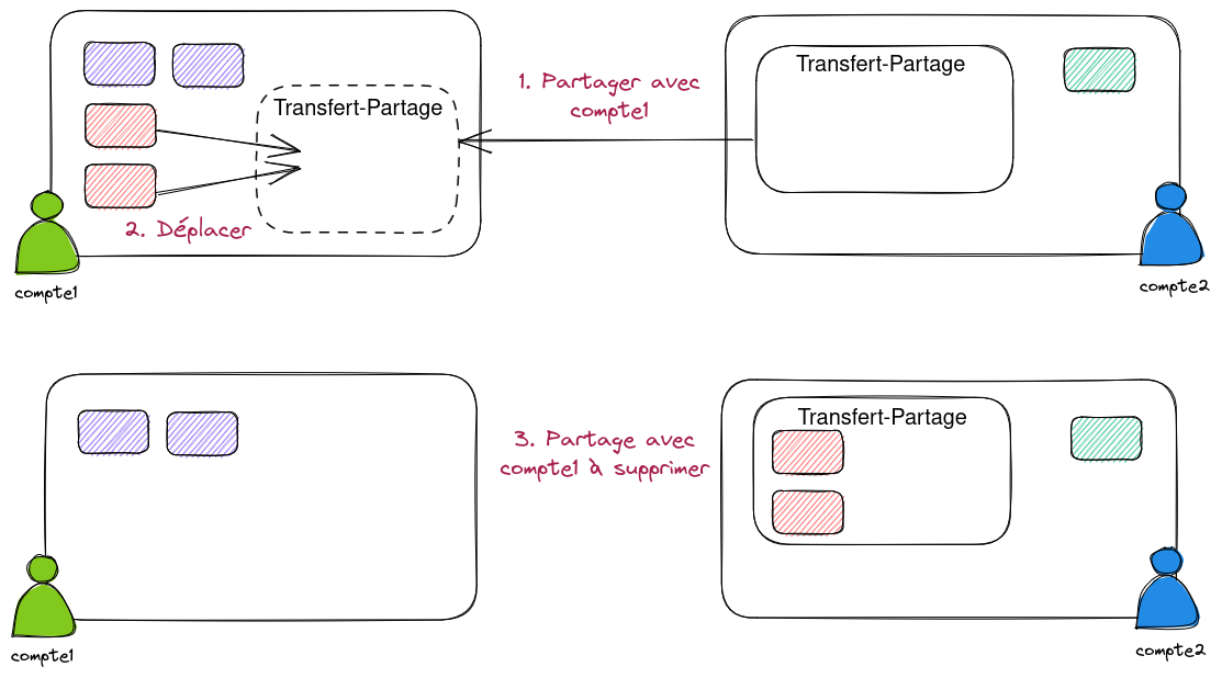 Depuis le compte1, on voit le dossier vierge (“transfert-partage”) apparaitre. Il suffit de déplacer tous les dossiers de compte1 vers ce dossier “transfert-partage” (qui appartient à compte2).