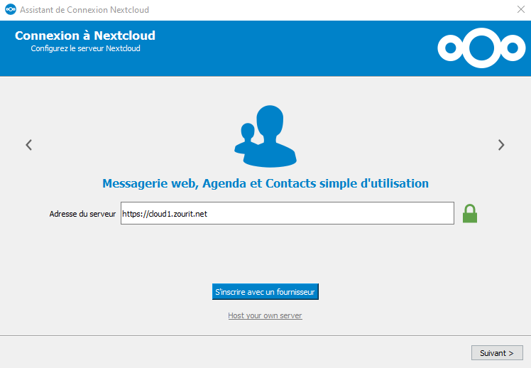 Renseigner l'adresse cloud1.zourit.net (ou cloud2 ou une autre adresse selon l'instance rattachée à votre compte). Cliquer sur suivant . Une fenêtre s'ouvre dans votre navigateur, cliquer sur se connecter .
