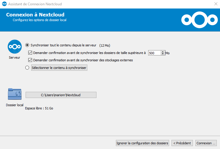 Les fichiers/dossiers synchronisés seront copiés dans ce dossier (par défaut sous Windwos dans C:\Users\[votre session]\Nextcloud).