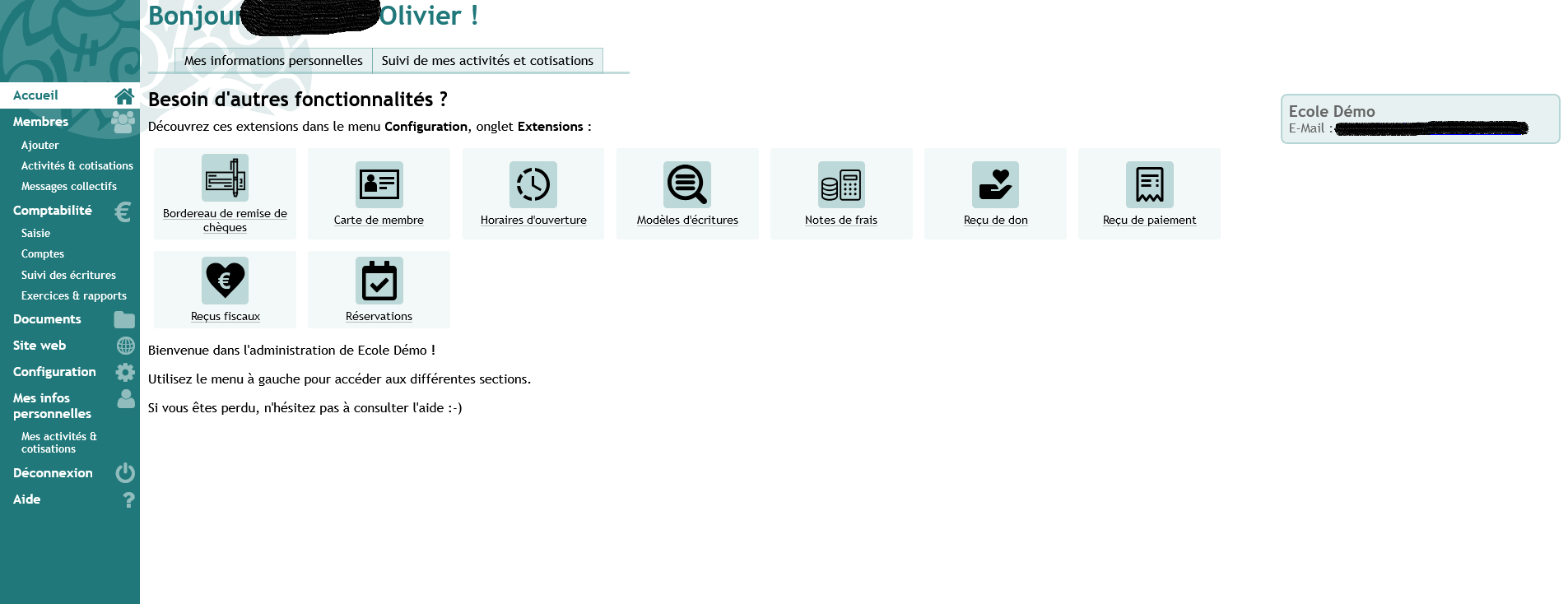 Il vous permet de gérer de nombreux aspects comme la gestion des adhérent·e·s, les cotisations, les activités, les rappels, les adhésions en ligne (mais sans paiement). Mais aussi pour les aspects financiers, la comptabilité à double entrée, le suivi des recettes, dépenses, dettes, banques, bilan, résultat, rapport annuel…
