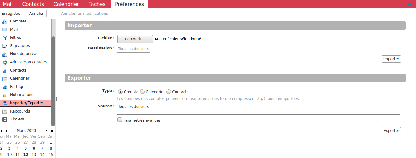 Attendre la fin de l'export complet avant de fermer la fenêtre de Zimbra.