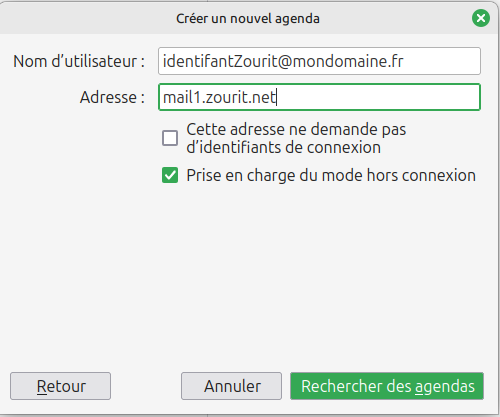 Saisissez ensuite votre identifiant Zourit et l'adresse de votre serveur Zimbra : mail1.zourit.net