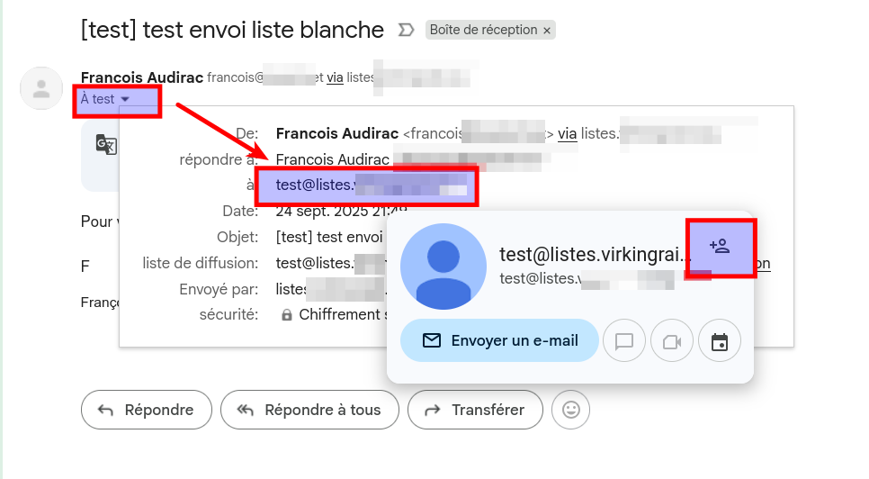 2. Vous pouvez aussi ajouter l'adresse de la liste comme “Contacts” de votre compte. Donc en cliquant sur l'adresse d'expédition en “xxx@listes.votredomaine.fr” il suffit de l'ajouter comme contact en cliquant sur le “+” pour l'ajouter en indiquant le nom de votre choix.