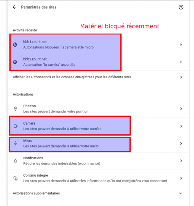 Il faut alors cliquer sur “Caméra” et “Microphone” pour modifier les autorisations qui auraient été refusées précédemment.
