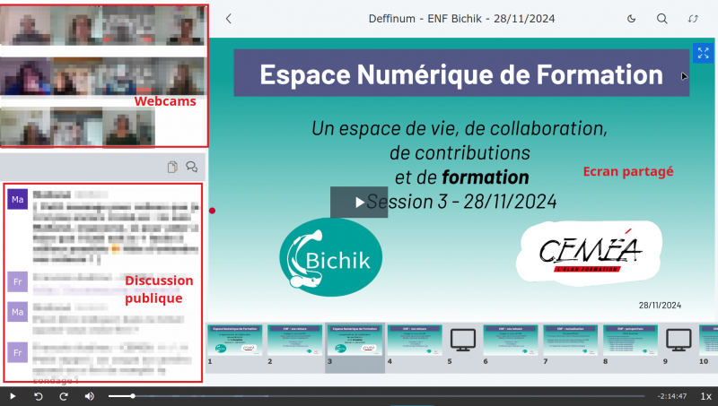 • le formation “Présentation” qui comprend un mode fenêtré avec : les webcams en miniatures, un déroulé de la discusion publique, l'écran partagé au centre qui contient les documents projetés. C'est un résumé complet de la visio.