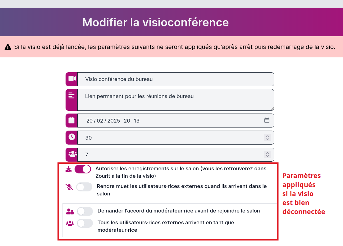 Si vous souhaitez modifier les paramètres d'une visio, un bandeau d'alerte vous informe :