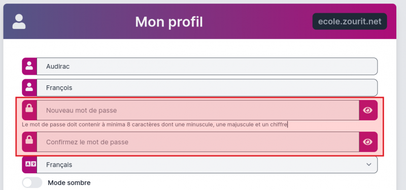 Attention, en cas d'oubli, il ne sera pas possible de le récupérer de manière autonome car il n'y a pas de procédure de rappel de mot de passe. C'est votre responsable / administrateur·ice qui pourra réinitialiser votre accès avec un nouveau mot de passe que vous devrez à nouveau changer par la même procédure.