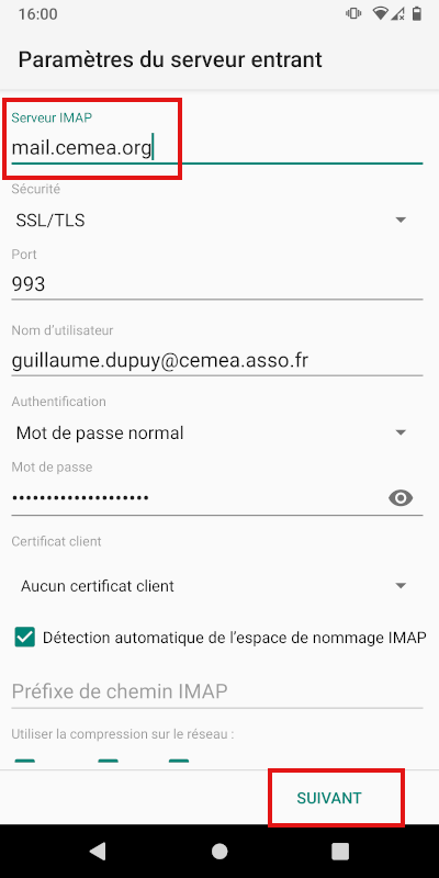 Il faut juste changer le serveur IMAP pour mail1.zourit.net , comme ceci, puis cliquez sur « Suivant » :