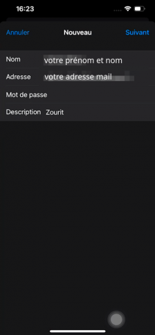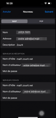 votreadresse@votredomainezourit.fr(ou votre domaine dans Zourit.net) - Mot de passe :
