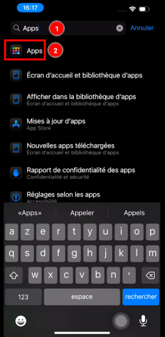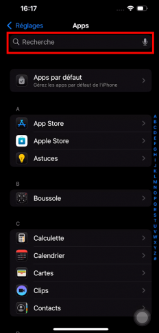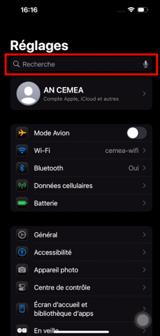 Dans la partie « Réglages » de l'Iphone, ouvrez la recherche.