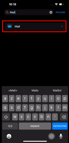 Dans « Apps », cliquez sur la recherche, écrivez « Mail » et cliquez sur « Mail ».