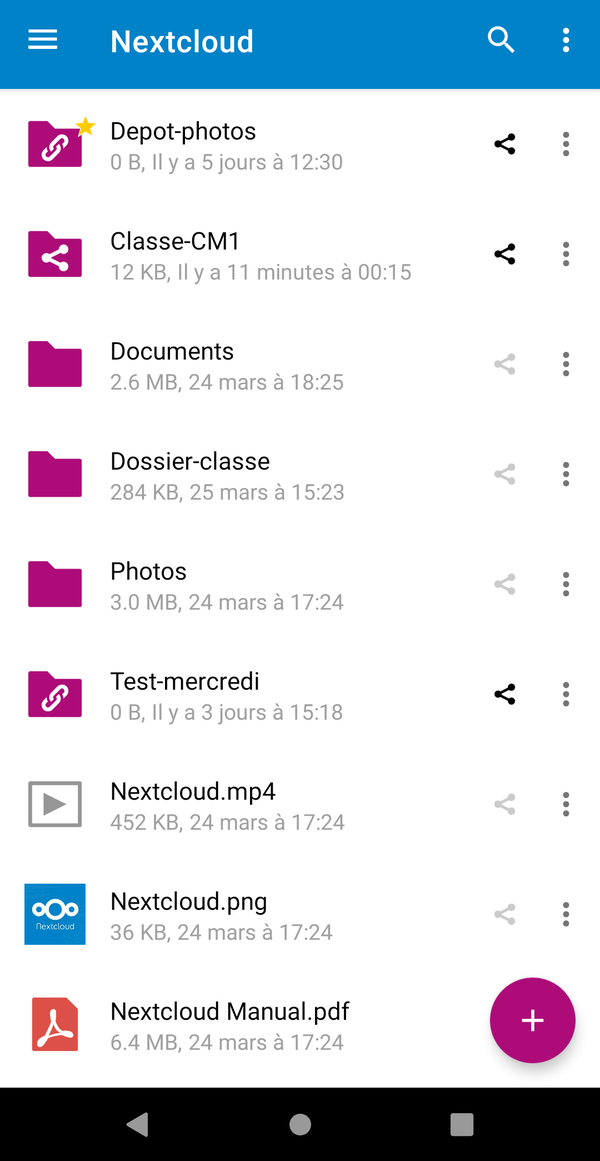 Le “+” en bas au centre sert à téléverser des fichiers depuis le smartphone ou la tablette. Il y a également un outil pour scanner un document, ou bien créer un mémo vocal.