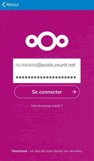 Il faut renseigner l'adresse du serveur : par exemple cloud1.zourit.net (ou cloud2 ou à adapter selon le cloud que vous utilisez) (Se rendre dans votre cloud Zourit via l'interface web puis dans Paramètres en bas à gauche pour connaitre le nom du cloud rattaché à votre compte)