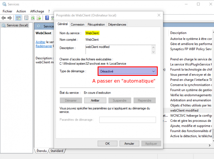 NB : Sous Windows, si vous rencontrez des erreurs à la création ou au montage du lecteur, recherchez et lancer “services” en tant qu'administrateur. Rechercher le service 'Webclient“, faites un clic-droit / Propriétés et activer le démarrage “automatique”. Puis redémarrez votre PC.