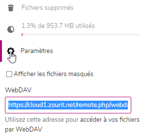 En bas à gauche, cliquez sur Paramètres et vous copiez le lien que vous voyez (celui qui contient webdav…). Il ne commence pas nécessairement par cloud1…