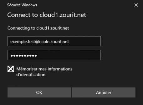 Cliquez sur OK (Si vous êtes sur un ordinateur que vous utilisez seul·e, vous pouvez mémoriser vos informations d'identification)
