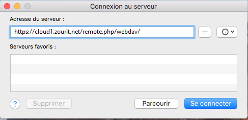 Sélectionnez (à gauche) le partage “cloud1.zourit.net”, puis cliquez sur Webdav.