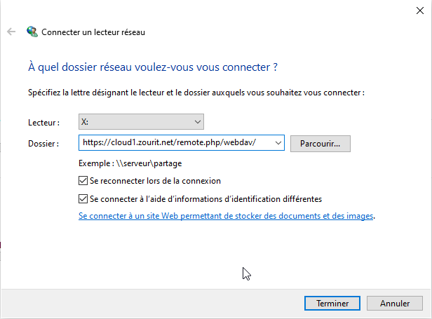 En choisissant une lettre de lecteur disponible, vous collez dessous le lien (qui peut varier d'un utilisateur à l'autre) que vous aviez copié dans la fenêtre qui s'ouvre à vous.