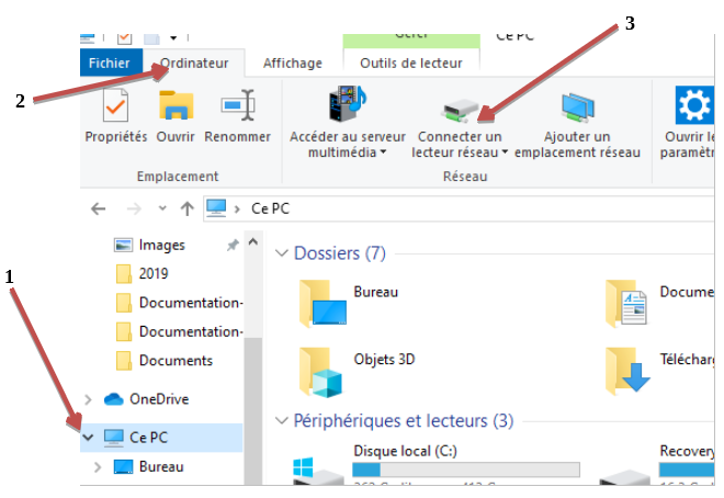 Par la suite, ouvrez votre explorateur de fichiers et vous rendez vous dans 1. Ce PC / 2. Ordinateur / 3. Connecter un lecteur réseau