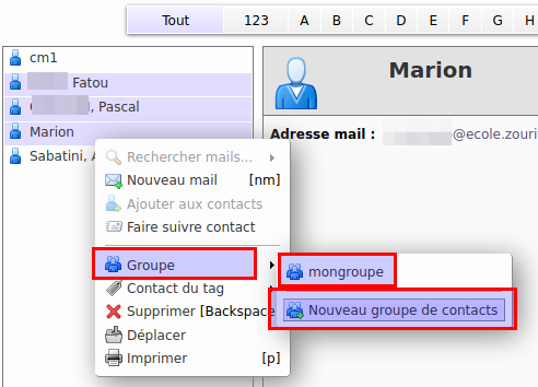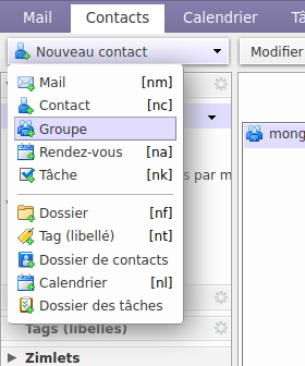 Vous pouvez aussi le faire en sélectionnant plusieurs contacts (en maintenant enfoncée la touche Ctrl) et en choisissant avec un clic-droit : Contacts → Nouveau Groupe de contacts. Vous pourrez ensuite ajouter des contacts supplémentaire à cette liste.