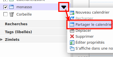 Pour partager son calendrier avec d'autres utilisateurs de Zourit, cliquer sur la pointe noire à droite du calendrier et choisissez “Partager le calendrier”.