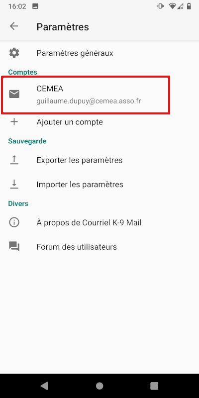 Par défaut, K9-mail ne stocke que les 25 derniers mails que vous avez reçus, pour ne pas prendre trop de place (et rendre le premier téléchargement plus rapide). Parfois, il peut être utile d’avoir accès à plus de mails que juste les derniers. Pour cela, il faut aller dans les options du compte :