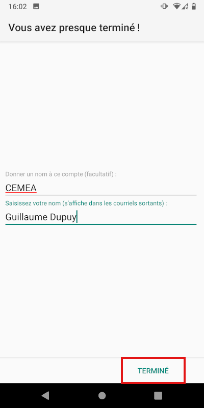 Sur le deuxième écran, donnez un nom au compte et saisissez votre nom (qui apparaîtra dans les mails sortants), puis cliquez sur «Terminé» :