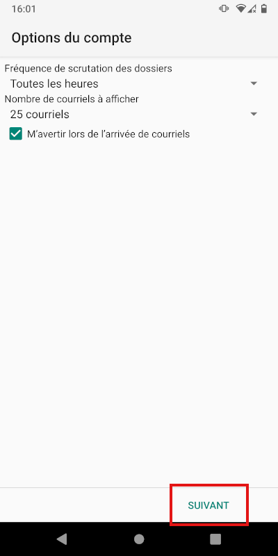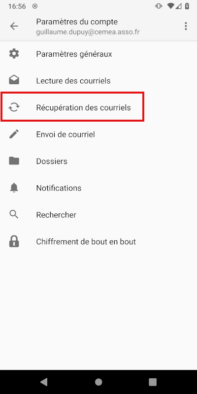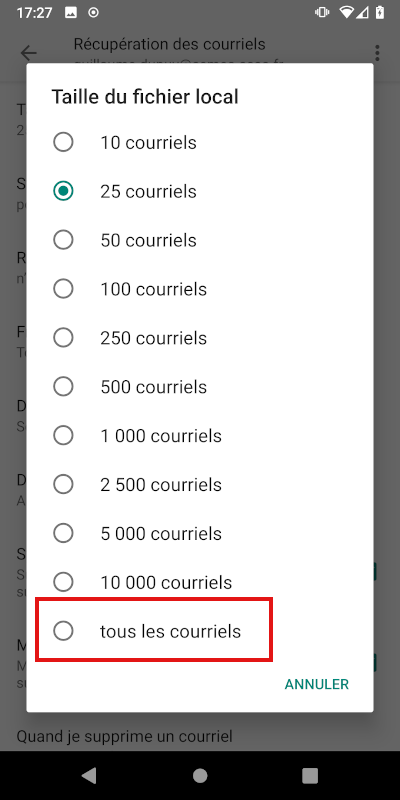 Attention ! Ici on récupère « tous les courriels », ce qui peut prendre beaucoup de place et beaucoup de données à télécharger sur votre téléphone. Si votre boîte mail est conséquente, vérifiez que vous avez assez de place sur votre téléphone et que vous êtes en wifi et pas sur le réseau mobile.