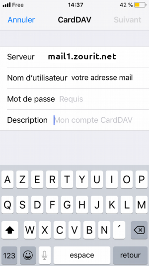 votreadresse@mondmainezourit.net(ou votre domaine perso dans Zourit) - Mot de passe :